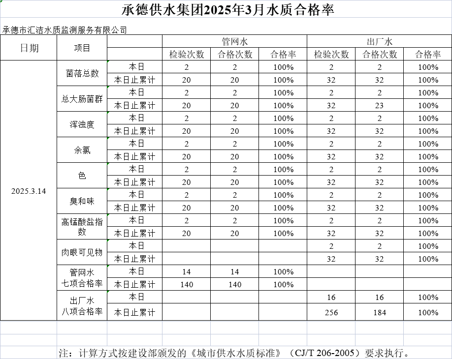 承德供水集團2025年3月14日水質合格率