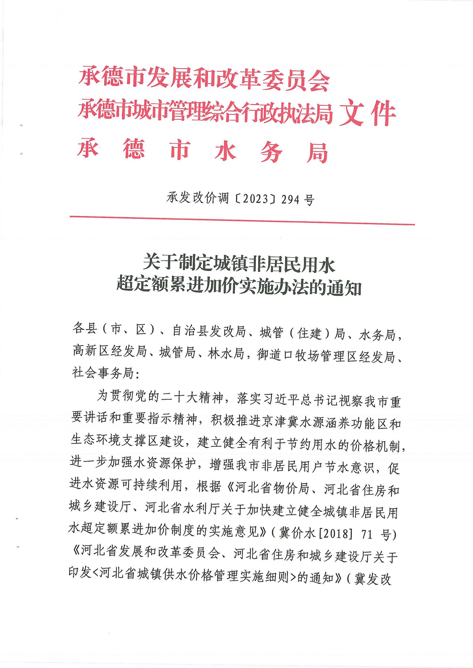 承德市發(fā)展和改革委員會等三部門關(guān)于制定城鎮(zhèn)非居民用水超定額累進加價實施辦法的通知 承發(fā)改價調(diào)〔2023〕294號